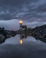 Het Paard van Marken op schiereiland Marken is een iconische vuurtoren die tegenwoordig oog fungeert als woonhuis. Op deze koude en bewolkte ochtend geeft het licht van de vuurtoren nog enig licht aan verder donkere grijze start van de dag. De weerkaatsing van het licht op de basaltblokken geeft alsnog een warme sfeer, terwijl de…