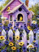 Een paars vogelhuisje met witte en houten accenten vormt het middelpunt van de compositie. Het is rijkelijk omringd door een bloemenzee met gele zonnebloemen, margrieten en diep paarse viooltjes, die samen een levendig kleurenpalet…