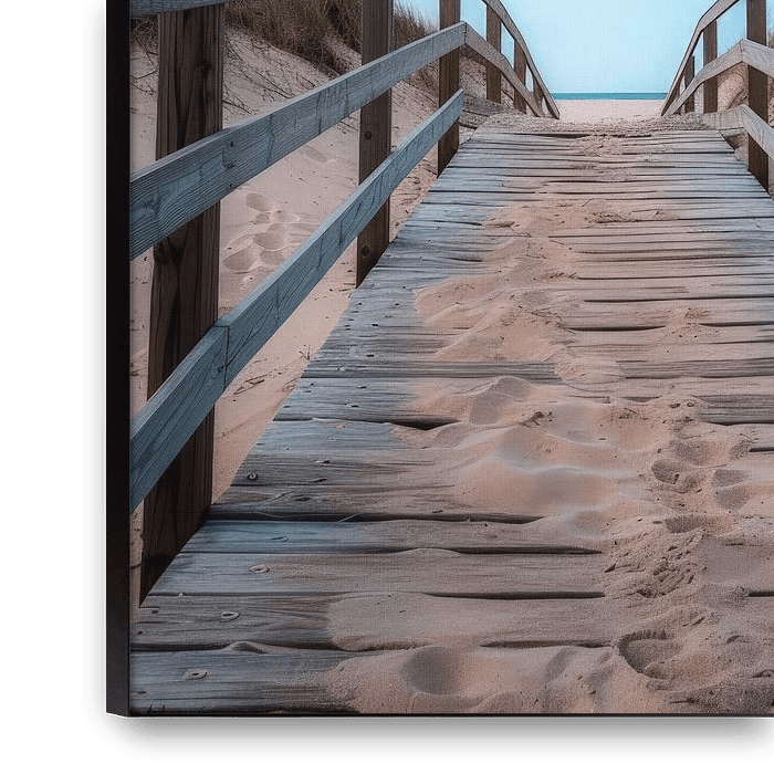 Het warme zand vult de ruimte tussen de houten planken en laat subtiele voetafdrukken achter van degenen die dit pad bewandelden. De reling aan weerszijden biedt…