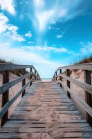 Dit rustgevende kunstwerk toont een uitnodigende houten loopbrug, met zijn rug recht en stevig verankerd in het zand, die een pad vormt door een landschap van duinen.
