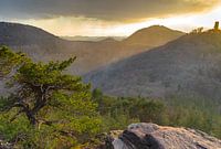 Het Pfälzerwald vanaf de Slevogtfelsen. Foto gemaakt vanaf de Slevogtfelsen in het Pfälzerwald in Zuid-Duitsland tijdens zonsondergang