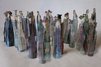 Geïnspireerd door de grote mensenmassa's die genoodzaakt zijn hun thuis te verlaten om elders een plek te vinden. Een groep mensen staat te praten, of te wachten op wat komen gaat. Ze zijn transparant, nog niet helemaal aanwezig in hun eigen lijf. De figuren zijn opgebouwd uit verpakkingskarton, datgene wat we meestal zonder nadenken…