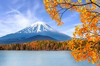 Een vredige idylle strekt zich uit aan de oevers van het schilderachtige Shoji-meer, terwijl op de achtergrond de majestueuze berg Fuji oprijst. Dit betoverende beeld, ingebed in ongerepte natuur en de sublieme pracht van de berg Fuji, nodigt je uit om te genieten van het moment van stille schoonheid in de herfst en je gedachten te laten dwalen.