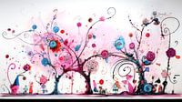 Verschillende bomen, rijk versierd met bloemen en abstracte patronen, vullen het beeld, waarbij hun takken zich uitstrekken in sierlijke krullen en spiralen. Deze krullen lijken bijna als confetti in de lucht te dansen, wat bijdraagt aan het feestelijke gevoel van het stuk. Tussen de bomen door zien we figuren die lijken te zijn weggelopen uit een kinderverhaal, elk met hun eigen unieke en excentrieke kenmerken. Het gebruik van heldere, levendige kleuren en onconventionele vormen geeft dit kunstwerk een speelse en droomachtige kwaliteit.