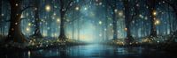 Een digitaal schilderij van dromerige rivier in een donker bos. Dit panorama kunstwerk heeft een langwerpige smalle vorm, waardoor het uitstekend geschikt is om de lengte van een ruimte te benadrukken.