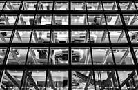 Het terrein van het Zeithaus in de Autostadt Wolfsburg. Gefotografeerd in zwart-wit