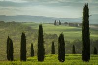 Tussen de groene heuvels zie je de 'Cappella Madonna di Vitaleta' en op de voorgrond een slingerpad met oude cipresbomen