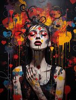 Dit schilderij uit de collectie 'Het Ontsluiten van de Geheimen van de Ziel' kijkt in de diepten van de menselijke ziel met doordringende ogen. Het vangt de essentie van zelfontdekking en introspectie, waarbij kijkers worden uitgenodigd om de raadselachtige uithoeken van hun eigen innerlijke wereld te verkennen.