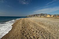 Een verlaten strand aan de Costa Tropical in Spanje. Alleen de voetsporen verraden dat er recent mensen geweest zijn.