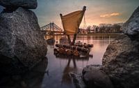 Klein vlot aan de oever van de Elbe met uitzicht op het Blauwe Wonder