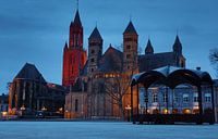Het Vrijthof in Maastricht in de avonduren, de verlichte kerk in het avondlicht
