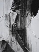 Tekening in krijt en houtskool van een vrouw die terugblikt op het verleden
