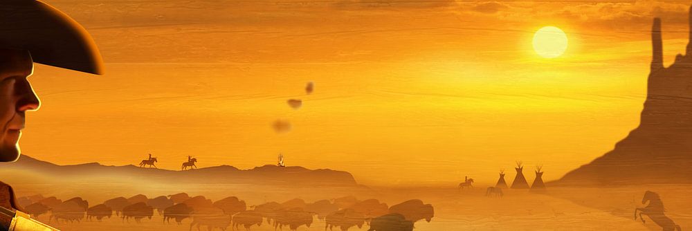 Sheriff met pistool in de weide, met Indianen, bizonkudde en een raaf. In de romantische licht van de zonsondergang. Het digitale schilderen met een portret van Bailey Chase, Branch Connally alias van Longmire.