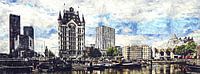 Digitaal mixed media kunstwerk van het Witte Huis, aan de Geldersekade, en de kubuswoningen in Rotterdam.