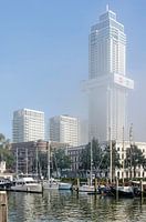We zien hier, terwijl de zon doorbreekt en de blauwe lucht zichtbaar wordt, nog wat mistflarden hangen rond de Zalmhaventoren. Dat is, voorlopig, het hoogste gebouw van Nederland, en het is bijna voltooid. Halverwege is nog de hijsloods te zien waarin de toren verdieping voor verdieping gebouwd is. Die loods is op weg naar beneden en zal spoedig ontmanteld gaan worden.