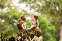 Twee jonge apen zitten samen boven op een met mos begroeide rots bij een tempel in Maleisië. Eén houdt liefdevol de hand van de ander vast, alsof ze midden in een klein huwelijksritueel zitten. Een speelse en hartverwarmende wildlife-foto die natuur, cultuur en humor samenbrengt.
