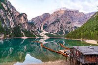 Houten boten langs de oever van de Pragser Wildsee, het Braies-meer, in de prachtige Dolomieten van Zuid-Tirol, Italië