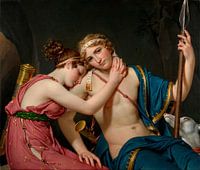 Met een dromerige blik fixeert de kale Telemachus de toeschouwer met zijn rechterhand op de dij van Eucharis, terwijl hij met de andere hand zijn zwaard rechtop houdt. In de Franse roman Les Aventures de Télémaque uit 1699, losjes gebaseerd op personages uit de Odyssee, beschrijft de auteur Fénelon hoe Telemachus, de zoon van Odysseus, hartstochtelijk verliefd werd op de mooie nimf Eucharis. Zijn plicht als zoon vereist echter dat hij hun romantiek beëindigt en op zoek gaat naar zijn vermiste vader. De noodlottige geliefden nemen afscheid in een grot op Calypso's eiland. Tegenover ons valt Telemachus' blauwe tuniek open om zijn naakte torso te onthullen. Eucharis, in profiel gezien, omcirkelt Telemachus' nek en rust zachtjes met haar hoofd op zijn schouder in berusting. Op deze manier zet Jacques-Louis David de mannelijke rechtschapenheid af tegen de vrouwelijke emotie. David schilderde Het Afscheid van Telemachus en Eucharis tijdens zijn ballingschap in Brussel. Het gebruik van verzadigde rood- en blauwtinten contrasteert met vleestinten en gecombineerd met een heldere lijn en vorm karakteriseert de neoklassieke stijl, die kenmerkend is voor Davids late historieschilderijen.