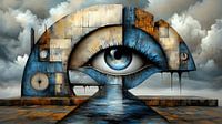 De foto toont een monumentaal bouwwerk gedomineerd door een enorm, alziend oog. Dit oog, ingebed in een afbrokkelende architectuur van verweerd beton en staal, lijkt zowel een wachter als een stille waarnemer te zijn. De wimpers van het oog zijn staalachtig, bijna mechanisch, en symboliseren een mengeling van menselijkheid en koude technologie. De kleuren van het schilderij bestaan uit roestige oranje en blauwe tinten, die het verstrijken van de tijd en het verval van de beschaving voorstellen.