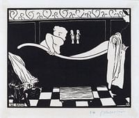 Een vrouw zit in bad en lijk er in of uit te stappen. het plaatje is monochroom, waardoor de tegels klassiek zwar-wit zijn. De vrouw zit naakt in de tobbe, waardoor rug, arm, schouder en tiet zichtbaar zijn.