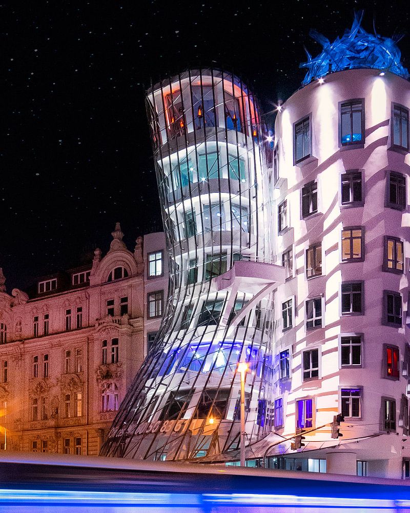 Het dansende huis van Praag van architect Vlado Milunić bij nacht met langsrijdende tram.