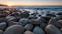 Het beroemde strand bij Uttakleiv met ronde rotsblokken op de Lofoten eilanden in Noorwegen op een heldere winterdag met besneeuwde bergen en een blauwe lucht na zonsondergang