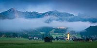 Het dorp Heiterwang in de Tiroler Alpen in de mist op een zomerse ochtend