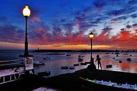Zonsondergang aan de haven Arrecife, Lanzarote, met spelend kind op de voorgrond en zojuist ontstoken lantarens.