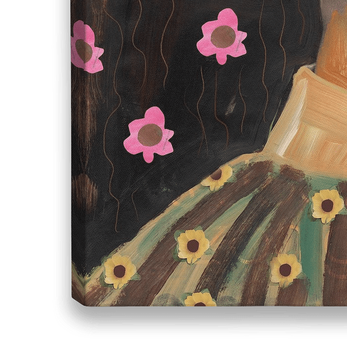 Het bloemen meisje - flower power. Mixed media portret met roze bloemen en gele bloemen. Portret van een vrouw met haar hoofd tussen haar handen. Herfst kleuren.