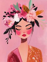 Een speels en kleurrijk kunstwerk vol vrouwelijke zachtheid en kracht. De serene vrouw met gesloten ogen straalt rust uit, terwijl de bloemenkroon in rijke tinten roze, rood en oranje een levendige en optimistische energie toevoegt. Het werk combineert verfijnde details met expressieve penseelstreken en is een echte blikvanger die warmte en vrolijkheid in elk interieur brengt.