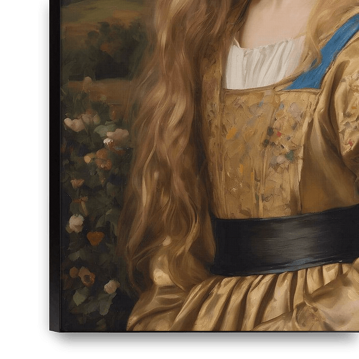 Een meesterlijk geschilderd portret van een blond meisje, gevangen in de pracht van de renaissance. Bewonder de verfijnde details van de bloemenkrans die haar hoofd omringt, een symbool van jeugd en onschuld. Dit schilderij, doordrenkt met chiaroscuro, vangt het subtiele spel van licht en schaduw op een manier die doet denken aan de…