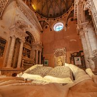 Marmeren tombe in kloosterkerk in Sevilla, Spanje, met opengeslagen boek