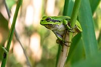 Dit boomkikkertje is op weg naar het bovenste deel van de struik. Hier kan hij in het zonnetje opwarmen. Deze foto is gemaakt in de Brand in Udenhout/ Noord-Brabant/ Nederland