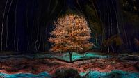 "Het bos om mij heen veranderd (en ik word erin mee gezogen)" is een digitale bewerking van een door mij zelf gemaakte foto van een prachtige, bevroren en vrij staande boom in herfstkleuren aan de rand van een bos. Het is een bewerking met Photoshop en Ai.