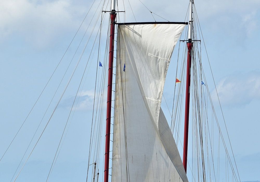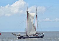 Het bruine vloot schip de Vliegende Draek,vaart terug naar de haven van Harlingen met passagiers,na een tocht over de waddenzee.