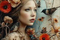 "Het buitenmeisje", bijzonder portret van een meisje omringd door vogels, bloemen en vlinders. Kies zelf het formaat en materiaal bij deze blikvanger en maak haar helemaal passend voor jouw interieur. Een vervolg op een ander werk dat ik eerder maakte "Garden of Eden"