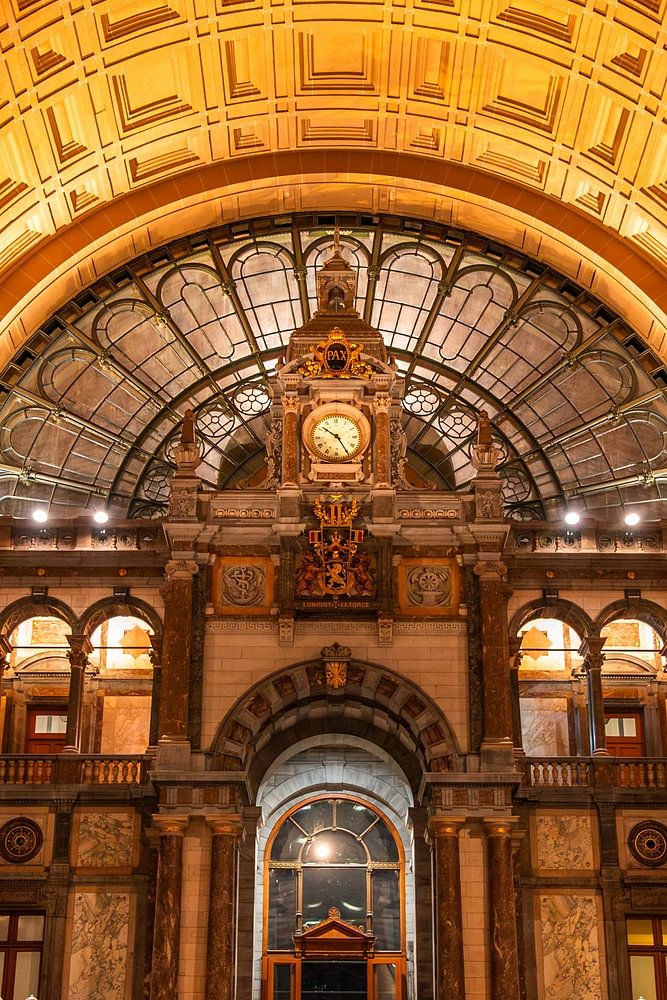 Het Centraal Station van Antwerpen, een architectonisch meesterwerk: Deze adembenemende foto toont het prachtige interieur van het Centraal Station van Antwerpen. Dit station staat bekend om zijn indrukwekkende architectuur en wordt vaak beschouwd als een van de mooiste treinstations ter wereld. De foto legt het grootschalige ontwerp vast, met zijn hoge gewelven, gedetailleerde versieringen en majestueuze glazen koepel die het station overspant.