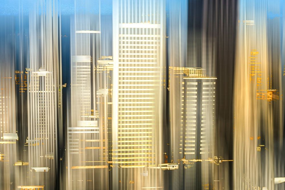 Abstractie: foto met meervoudige belichting en veegeffect Skyline van het centrum van San Francisco met wolkenkrabbers in Californië, VS
