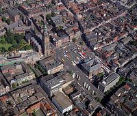 1990: Historische luchtfoto van het centrum van de stad Groningen met de Martinitoren op de Grote Markt in Nederland