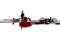 Abstract werk van Roberto Moro met fijne lijnen en zwarte en rode vormen.