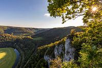 Uitzicht van Eichfelsen in het Boven-Donau-dal tot aan de Donau, Natuurpark Boven-Donau, Zwabische Alb, Baden-Württemberg, Duitsland.