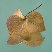 "Het dansende hortensiablaadje met turquoise achtergrond" is een macrofoto van een hortensiablaadje dat al langzaam aan het vergaan is. Je ziet de prachtige nervenstructuur al duidelijk en het blaadje heeft een lichtbruine (taupe / beige) kleur gekregen. Omdat het blaadje op een reflecterende / spiegelende ondergrond ligt, zie je in het grondvlak ook het blaadje terug.