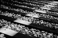 Een baan zonlicht valt over zware stalen profielen die op de grond liggen en waartussen grof grind, grijze steenslag, ligt. Ik maakte deze foto in de herfst, laat in de middag, de zon staat al laag en zal binnenkort verdwijnen. Door de omgeving buiten de foto is er nog een smalle strook zonlicht in beeld. Het is een grafisch compositie geworden. De zon komt van rechtsboven schuin binnen, terwijl de stalen banen diagonaal in de andere richting lopen. Ik vind dit een krachtig patroon, ondersteunt door het expressieve contrast. Dit is waar zwartwit fotografie heel goed in is.