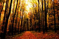 Een mystiek bos in de herfst in donkere oranje en zwarte tinten