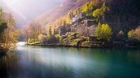 Het oude dorp Isola Santa en het meer tijdens de herfst, panoramisch uitzicht.