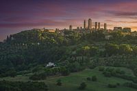 De middeleeuwse torens van het oude dorp San Gimignano bij zonsondergang. Provincie Siena, Toscane, Italië