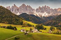 Santa Maddalena ook wel St. Magdalena in het Duits genoemd is een bekend en mooi pittoresk dorpje in de Val di Funes in de provincie Bolzano in Zuid-Tirol (Alto Adige) in Italië. Santa Maddalena is een klein schilderachtig dorpje en omgeven door de indrukwekkende toppen van de Dolomieten, met name de Odle-bergen of Geislergroep op de achtergrond met zijn scherpe en spitse toppen. Het dorpje staat ook bekend om zijn wijnbouw. en in het dorp zelf bevindt zich de symbolische Santa Maddalena Kerk die vaak wordt afgebeeld op ansichtkaarten en wordt gezien als een icoon van de Dolomieten. Het is een prachtig gezicht met de kerk op de heuvel tegen de achtergrond van de ruige bergen. De vallei staat bekend om zijn kilometers lange bossen, fluweelzachte groene hellingen en steile rotswanden. Het is een waar paradijs voor wandelaars en natuurliefhebbers. Het ligt in de nabijheid van het Natuurpark Puez-Odle, dat deel maakt uit van het UNESCO Werelderfgoed. De foto maakte ik in de herfst met een fototourwandeling.