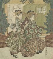 Nummer Vijf: The First Writing of the New Year by Hitofude from Tamaya, Yashima Gakutei, c. 1827 "Hitofude, een hooggeplaatste courtisane van het Tamaya-huis, paradeert met haar dienstmeisje (kamuro) en leerling-courtisane (shinzo) door Nakanochô, de hoofdstraat van het plezierdistrict Yoshiwara in Edo (het huidige Tokio). Met twee gedichten. De linkerpagina van een vijfluik, met afbeeldingen van hooggeplaatste courtisanes (oiran) uit de verschillende huizen van de Yoshiwara." "Een surimono is een luxe prent waarin een afbeelding gecombineerd wordt met een of meer gedichten. Bij het drukken van een surimono werd vaak gebruik gemaakt van dikker papier, blinddruk en metaalpigmenten, zoals koper- en zilverpoeder. De prenten werden vaak in opdracht van dichters gemaakt en als exclusief geschenk aan vrienden en relaties gegeven." Rijksmuseum Amsterdam kleurenhoutsnede ukiyo-e Legacy of J.A. Bierens de Haan, Amsterdam