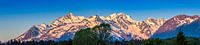 Vlak na zonsopkomst kleuren de bergen roze. De sneeuw licht op door de eerste zonnestralen.