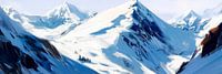 De foto toont majestueuze, besneeuwde bergen die oprijzen onder een helderblauwe hemel. De ruige toppen lijken indrukwekkend en ongenaakbaar, omringd door glinsterende sneeuwvelden. De kleuren harmoniëren prachtig en geven het landschap een vredige, bijna magische uitstraling die uitnodigt tot dromen en verkennen.
